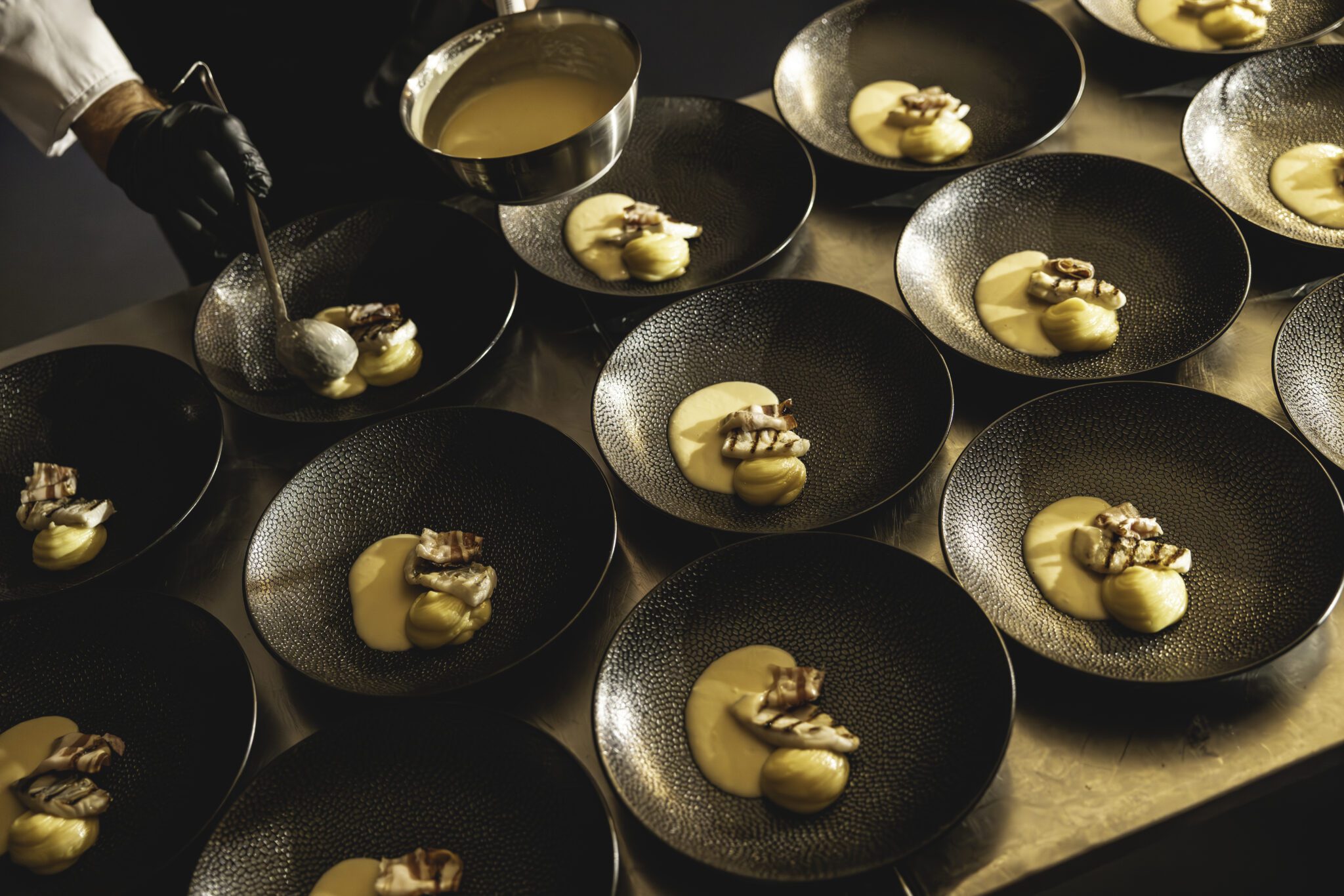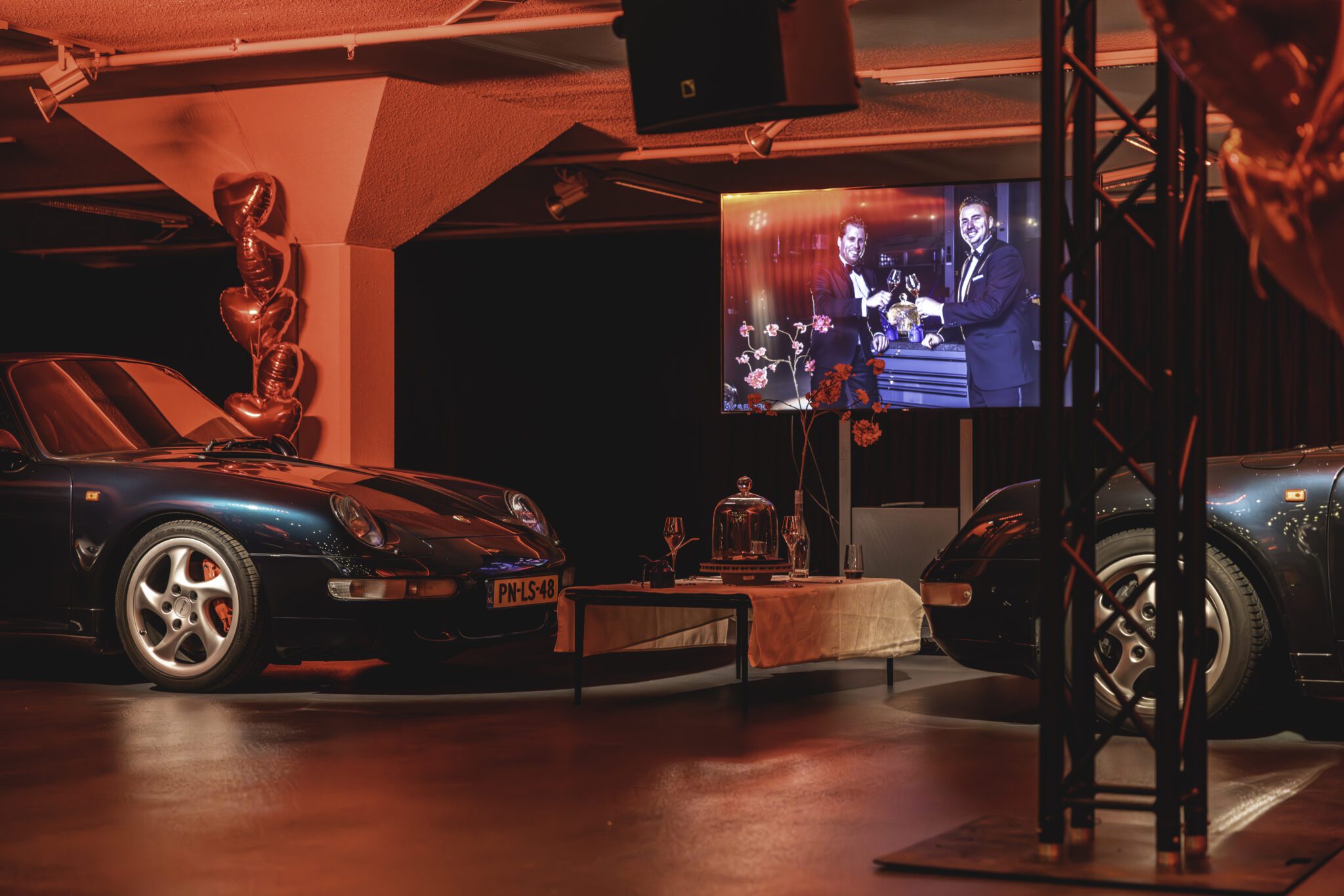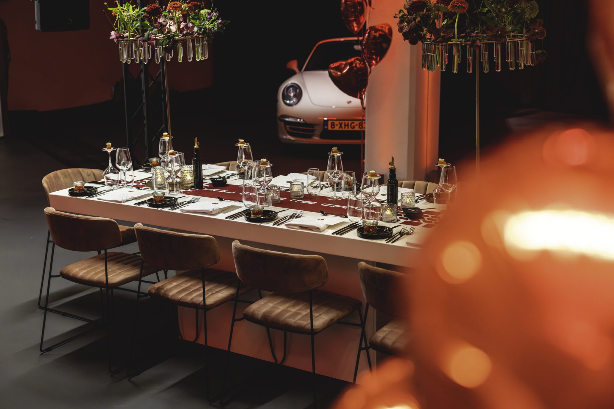 De Porsches stonden stijlvol rondom de tafel, volledig gestyled door Van der Maarel. Gasten werden ontvangen met bubbels met rozenblaadjes en granaatappelpitjes. Live cooking zorgde voor een culinaire beleving, terwijl Porsche-medewerkers in sloof het dessert afmaakten en serveerden. De auto’s waren spectaculair uitgelicht, met een thematische menukaart en zelfs Porsche 911 botertjes.